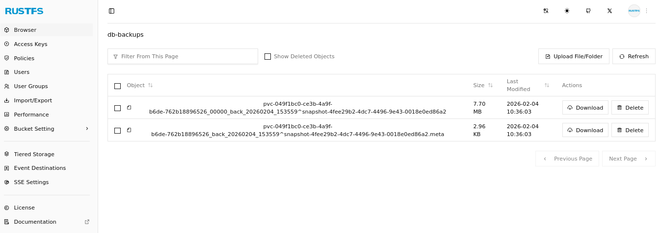 Output will be similar to the following and show that a volume snapshot and its metadata object are now in your RustFS object storage bucket:
